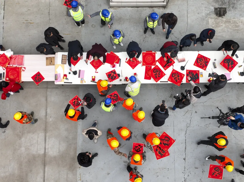 笔下熠熠生辉,心中满满诗情。活动现场,美术、书法工作者为一线工人现场创作了“人添志气虎添翼,雪舞丰年燕舞春”“山明水秀风光丽,虎跃龙腾日月新”“四海三江春气息,千家万户虎精神”等一幅幅满载新春祝福、寓意美好前景的春联和“福”字、国画作品。摄影工作者为一线建设者拍摄了纪念照,并现场打印赠送给农民工朋友。