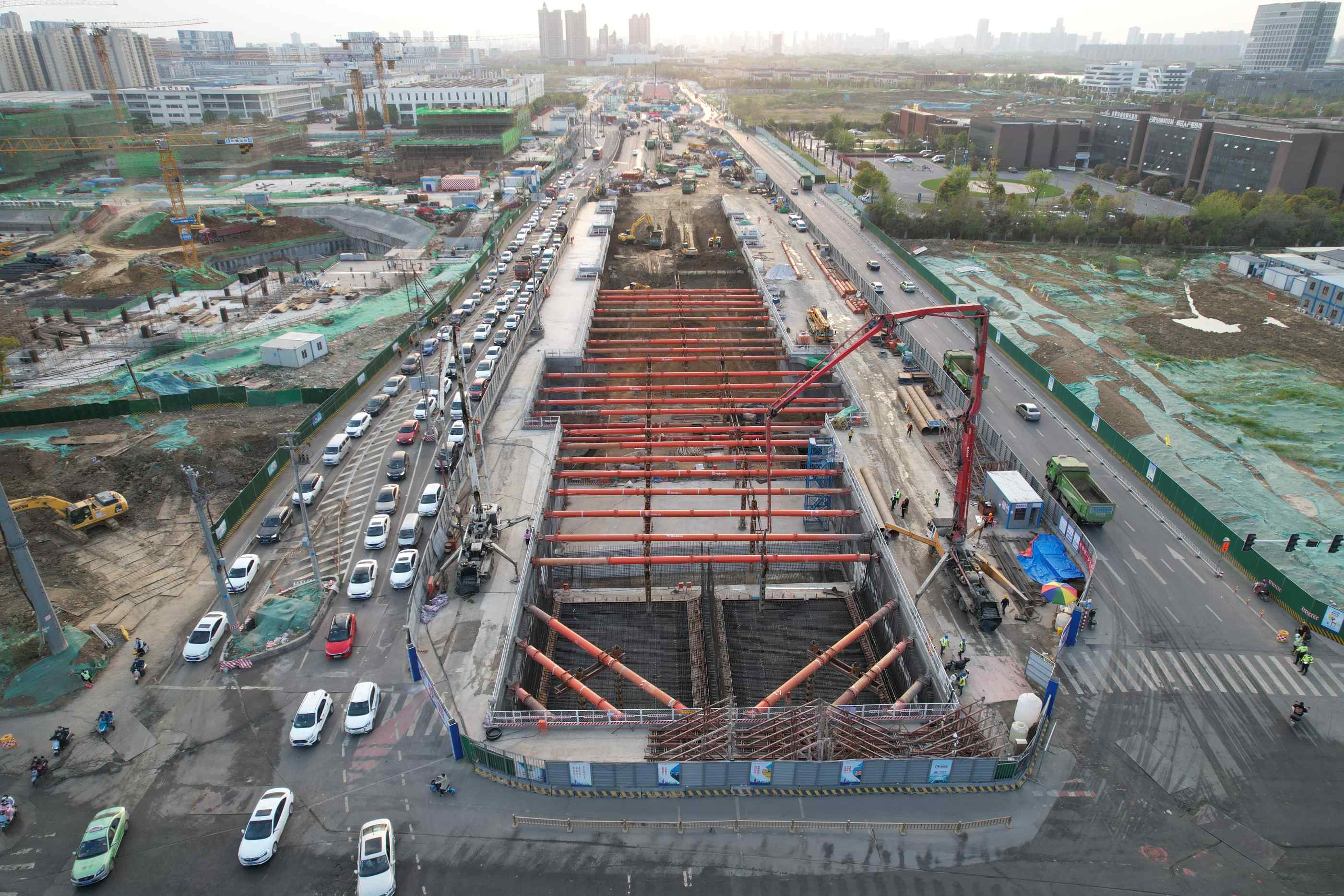 4月7日上午,随着最后一车混凝土的缓缓落下,锦绣大道隧道首节混凝土浇筑顺利完成,标志着宿松路快速化改造工程锦绣大道节点正式进入隧道主体结构施工阶段。